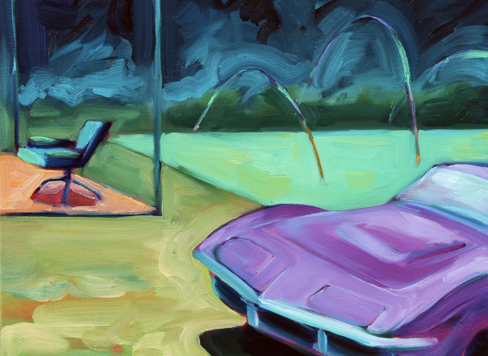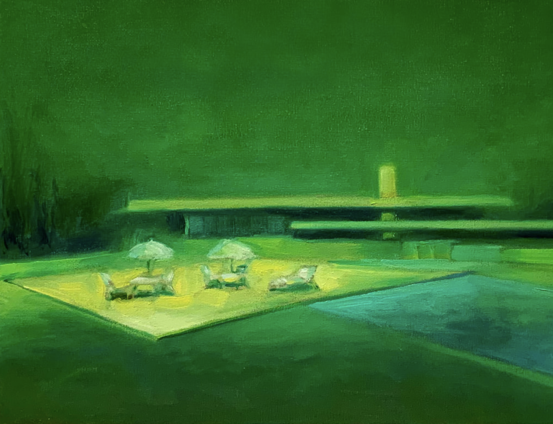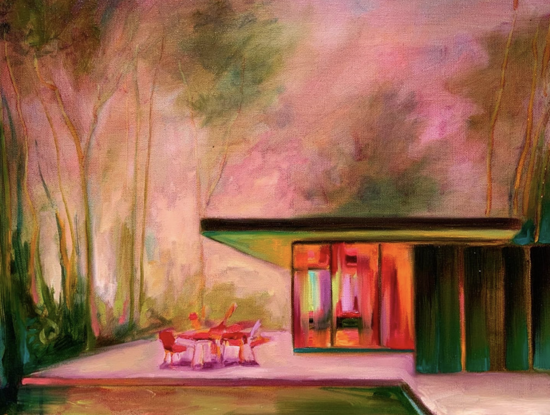 In my paintings I like to explore the intersection of modernism, recreational pursuits, and the lure of escapism. The architectural elements and interiors in my oil paintings are usually fictionalized interpretations of homes that transcend the ordinary and evoke a certain time and place often with a sense of nostalgia. My aim is to utilize colour that is alluring and evocative but at times even otherworldly and arresting. These residential "fortresses" often keep the natural world at bay through landscaping, swimming pools, fences and decor. I am interested in images of the sublime and the connections between material worlds and natural worlds. Ultimately, my art is about collective longing, the things we can control and the things we cannot.